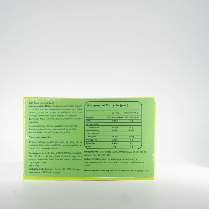 - Η μαρμελάδα DXN Apple Fermented Jam είναι ένα προϊόν που παρασκευάζεται από φρέσκα μήλα που υποβάλλονται σε φυσική διαδικασία ζύμωσης.