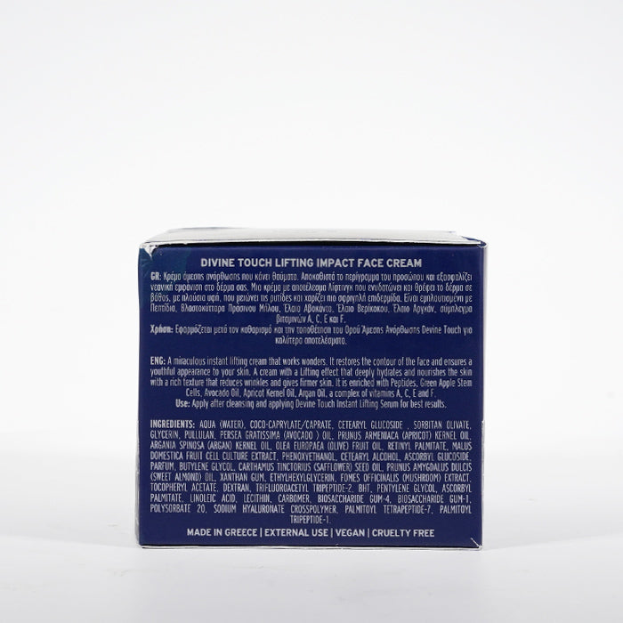 Κρέμα άμεσης ανόρθωσης που κάνει θαύματα. Αποκαθιστά το περίγραμμα του προσώπου και εξασφαλίζει νεανική εμφάνιση στο δέρμα σας. Μια κρέμα με αποτέλεσμα Λίφτινγκ που ενυδατώνει και θρέφει το δέρμα σε βάθος, με πλούσια υφή, που μειώνει τις ρυτίδες και χαρίζει πιο σφριγηλή επιδερμίδα. Είναι εμπλουτισμένη με Πεπτίδια, Βλαστοκύτταρα Πράσινου Μήλου, Έλαιο Αβοκάντο, Έλαιο Βερίκοκου, Έλαιο Αργκάν, σύμπλεγμα βιταμινών Α, C, E και F.